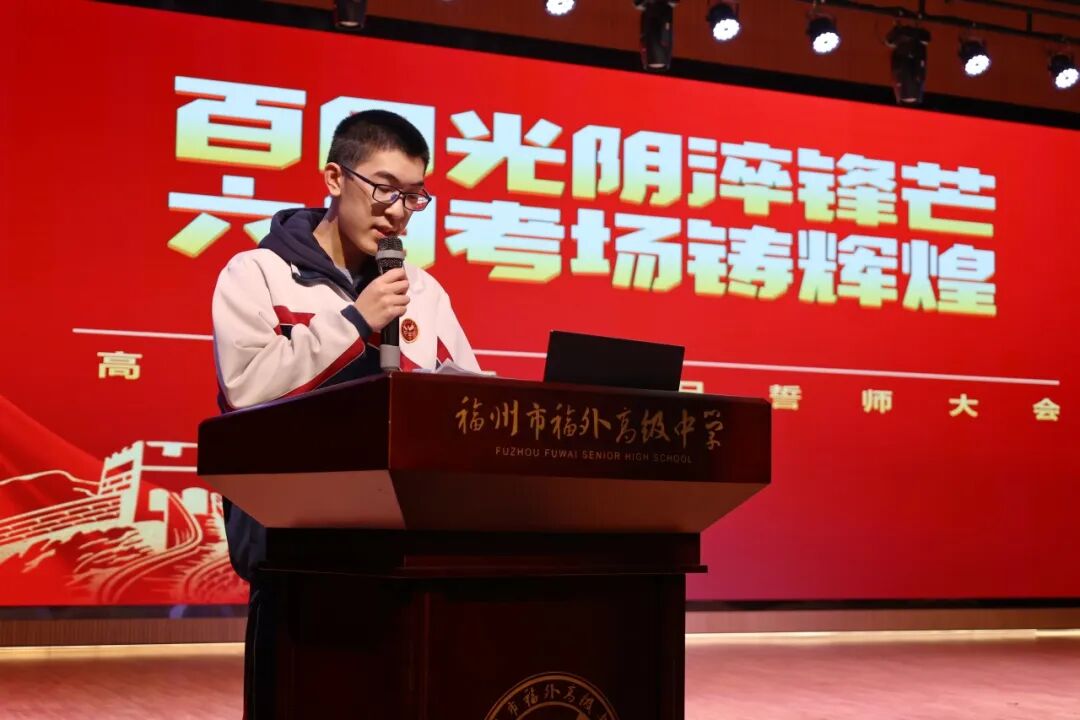 侯谨安同学以青春之名,发出冲刺高考的铿锵宣言。其言不仅道出了全体高三学子以笔为剑、劈波斩浪的坚定决心,更展现了以书为舟、扬帆远航的昂扬斗志。他用饱含激情的语言描绘出青春奋斗的壮美画卷——那是晨曦中书声琅琅的专注,是深夜里挑灯夜战的执着,是题海中披荆斩棘的勇毅,更是迷茫时彼此鼓励的温暖。每一句话语都如战鼓催征,激荡着在场每一个人的心灵,更凝聚着全体高三学子迎战高考的坚定信念与豪迈情怀。