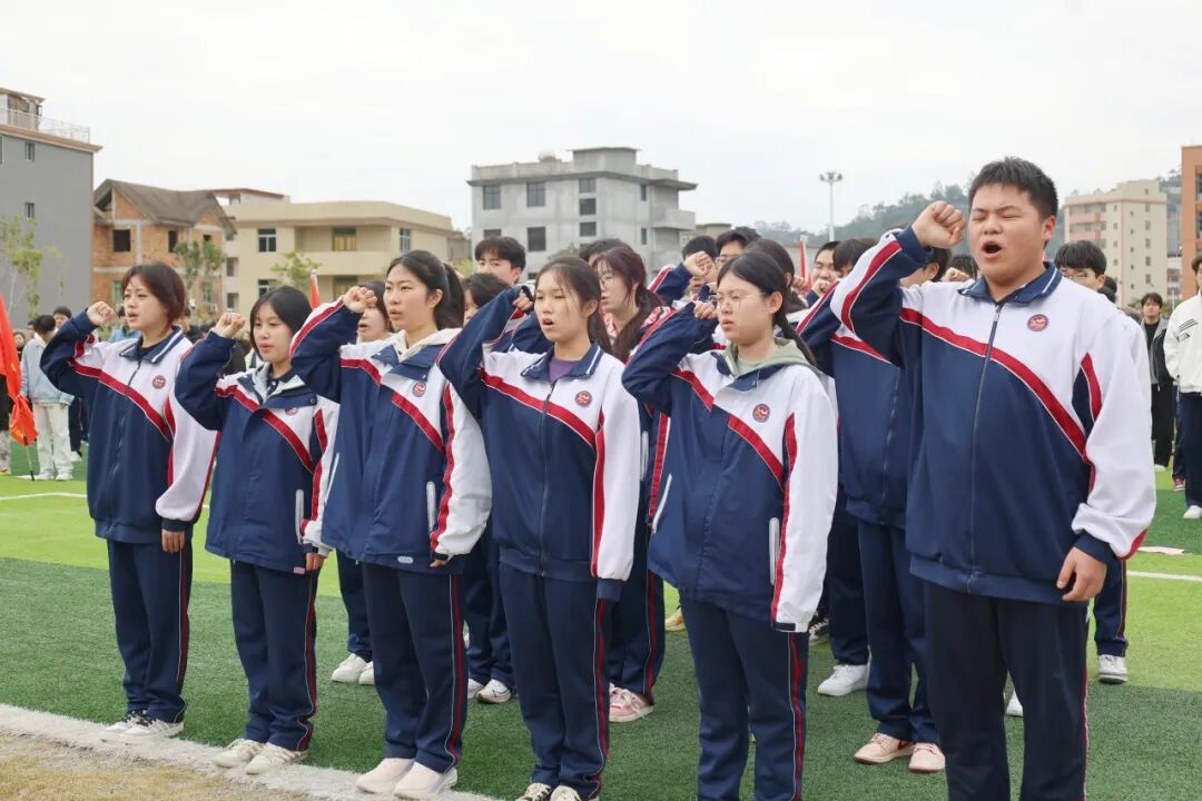高二(6)班的的同学们代表全体福外高中学子,在国旗下庄重宣誓:“目标明确,积极向上;勤学苦练,斗志昂扬;顽强拼搏,不弃不放;严守纪律,自信自强;全力以赴,创造辉煌!”